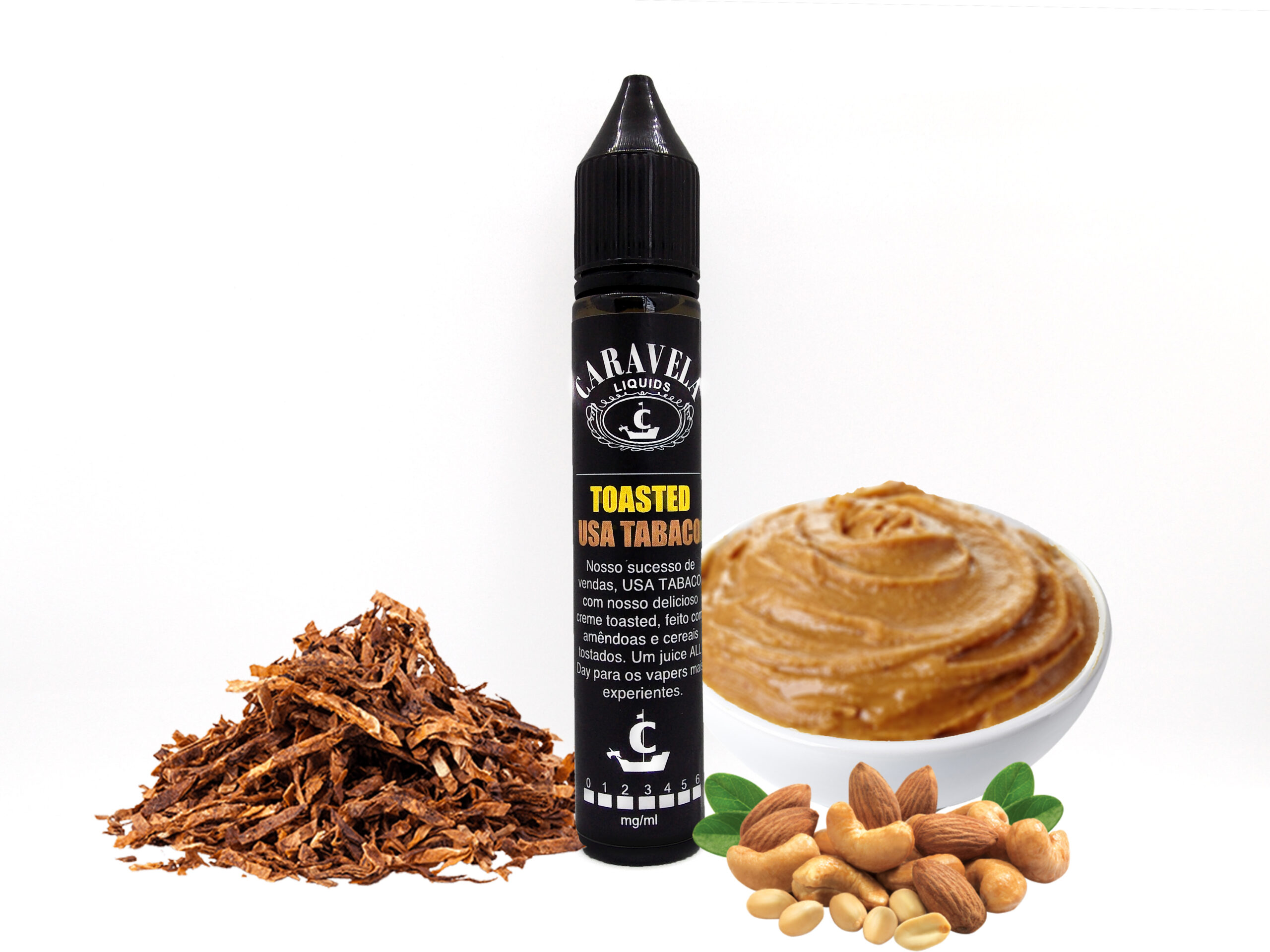 Nosso sucesso de vendas, USA TABACO com nosso delicioso creme toasted, feito com amêndoas  e cereais tostados. Um juice All Day para os vapers mais experientes.