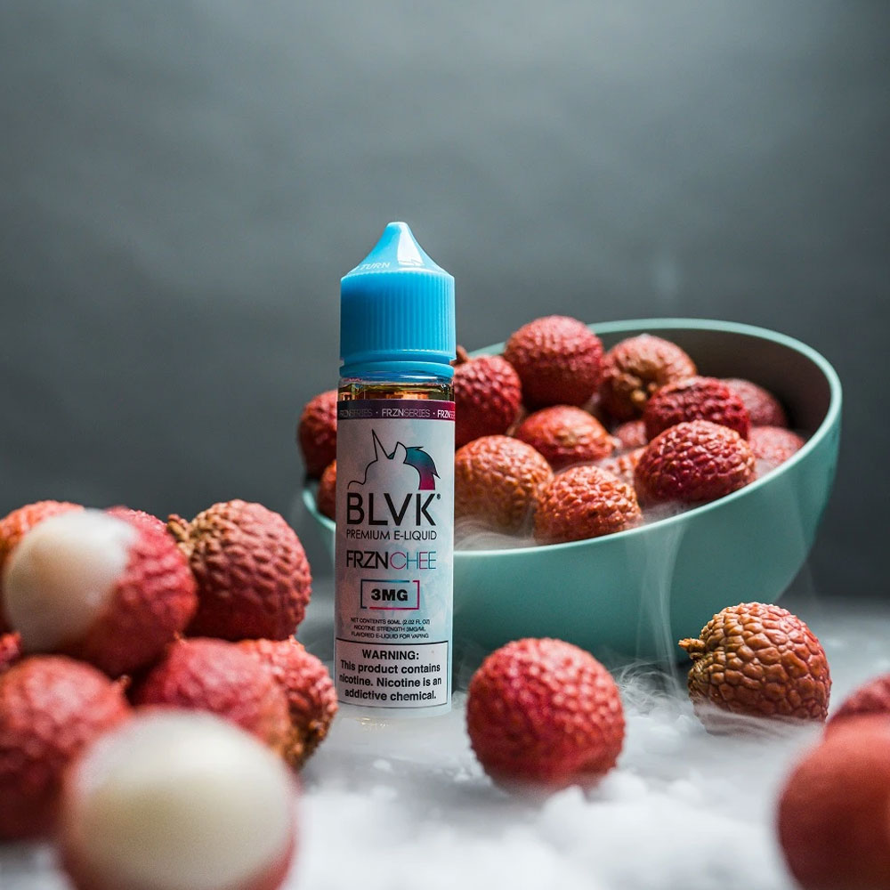 O líquido Frzn Chee da BLVK é uma mistura congelada e frutada de lichias deliciosas misturadas com um toque doce e em camadas com uma brisa de mentol para estimular o paladar.